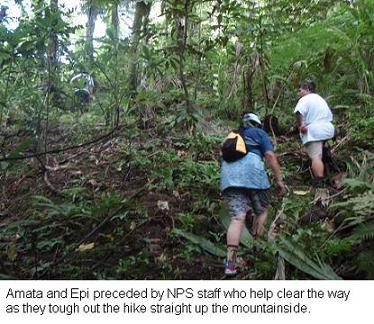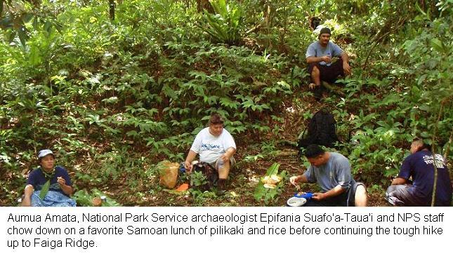 Vatia villagers have always known these sites that lie inside the National Park, exist on Faiga Ridge in Vatia. Led by NPS archaeologist Epifania Suafo'a-Taua'i, NPS staff, along with Aumua Amata visited the area on Friday, Jan. 9, 2009. It was a four hour hike up and four hours back from the ridge. The purpose of the hike was to record coordinates of the house sites, graves, grinding stones and pigeon-snaring star mounds — to map the finds for Global Positioning Systems (GIS) and Geographic Information Systems (GIS). The sites will be added to the national database of the U.S. National Park Service, under which the local park comes. Determining how old the sites are will come later. A look at the largest of about 25 ancient Samoan house sites found that measure 25 meters (about 82 feet) by 17 meters (56 feet). |