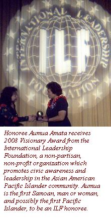 A long time community activist and member of numerous civic organizations, Amata also has served at the national level on the President's Advisory Commission on Asian Americans and Pacific Islanders and as assistant secretary of the 2000 Republican National Convention. She was 2003 "Woman of the Year" for the National Association of Professional Asian Women and was recipient of the International Leadership Foundation's "Visionary Award" this year. Pat Boone sings praises of Aumua Amata, other Lawmakers and Candidates August 08, 2008 ![]() PAT BOONE SINGS PRAISES OF LAWMAKERS AND CANDIDATES Legendary entertainer and 60 Plus Association national spokesman Pat Boone visited Washington, D.C. recently to present various lawmakers and candidates, among them congressional candidate Aumua Amata, with the organization's Honorary Guardian of Seniors' Rights Award. Aumua Amata is a candidate for American Samoa's non-voting delegate seat in the U.S. House of Representatives. She received the award along with U.S. Senator Wayne Allard (CO), U.S. Rep. Robert Aderholt (AL) and U.S. Rep. Joe Wilson (SC) in a ceremony near the U.S. Capitol recently. 60 Plus president Jim Martin said, "The Guardian Award is presented to Democrats and Republicans in Congress based on their 'senior friendly' voting records. The Honorary Award is given to those running for office and is based on their views on seniors' issues. We're pleased that Pat Boone took time from his busy schedule to present these citations. I know Aumua Amata was also appreciative. Pat Boone literally sang her praises." "Aumua Amata is always in the corner of the elderly and for that Pat Boone and I salute her," Martin said. Amata said she is deeply honored to receive the award and added that "caring for our elders is a fundamental obligation we have as part of our culture and we do it with joy, but I also want to be certain our senior citizens and their families get the full benefits all other Americans receive from the federal government." "Moreover, families who bear enough financial burdens as it is in caring for their senior members should not be penalized by having to pay an estate tax when they pass on," she added. "I stand with those who oppose such a tax." The 60 Plus Association is a 15-year-old nonpartisan organization working for death tax repeal, saving Social Security, affordable prescription drugs, lowering energy costs and other issues featuring a less government, less taxes approach. Reach the reporters at news.newsroom@samoatelco.com. Osini Faleatasi Inc. dba Samoa News reserves all rights. Amata's Pacific Notebook: Samoan Youth: Our Future is in good hands by Aumua Amata Reprinted from Samoa News July 19, 2008 This past Sunday I had the honor of being invited by Reverend Aliioaiga Filoialii to be part of his CCCAS Church worship service in Faleniu. My role was to present to the parents of Andrew Pati Ah Young the Mortar Board certificate of induction he received in April on the campus of the University of New Mexico in Albuquerque. ![]() Established in 1918, Mortar Board is a national honor society that recognizes rising college seniors for excellence in the areas of scholarship, leadership and service. Mortar Board members represent the top scholars and leaders on their campuses. In its 90 years of existence, only fewer that a quarter of a million students have been initiated at 226 chartered chapters across the United States representing the top schools in the country. Mortar Board provides opportunities for continued leadership development, promotes service to colleges and universities and encourages lifelong contributions to the global community. Additionally, Mortar Board offers numerous benefits and opportunities to members, including career networking, fellowships and awards. In short, it is a very prestigious group and we all can be proud that one of our own sons of American Samoa has become a member. Andrew was valedictorian for the Tafuna High School Class of 2005 and is attending UNM on a Bill Gates Millenium scholarship he told me he found as the result of an application announcement I had publicized in the media that year. Andrew and I have remained in communication since then and by the sheerest of coincidences my husband and I were scheduled to be at a conference in Albuquerque the day he was to receive the award. So he invited us to attend and we gladly did.