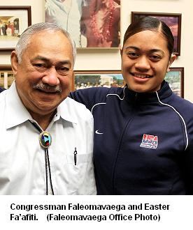 "I would like to again extend my congratulations to Easter for being a shining example for our Samoan youth in the U.S. and in American Samoa. Easter's athletic and academic accomplishments throughout high school, community college, and now at the university-level, are truly remarkable," Congressman Faleomavaega stated.