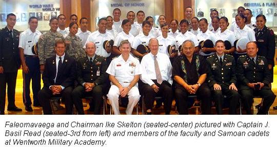 "I am honored and privileged to have been invited by Chairman Skelton to accompany him on this visit with the cadets from our homeland," Faleomavaega said. "I had the great opportunity to personally meet and talk with all the cadets from American Samoa who are currently attending the Wentworth Military Academy and those who graduated early this year and are now continuing their education at the University of Central Missouri."