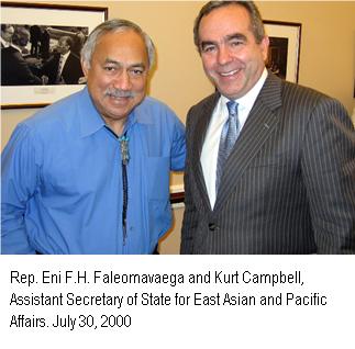 The Chairman of the Subcommittee on Asia, the Pacific and the Global Environment, Rep. Eni F.H. Faleomavaega, today sent Secretary of State Hillary Clinton a letter outlining his views on a path for the United States to help Fiji's resolve its longstanding political problems. He also conveyed his thoughts on the situation to Kurt Campbell, Assistant Secretary of State for East Asian and Pacific Affairs (America's top diplomat for the region), at a meeting the two participated in this morning. The Chairman developed his views in close consultation over an extended period of time with key leaders – including those from the opposition - representing all major constituencies involved in the political issues confronting the country.