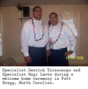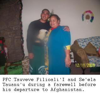 Departing into the combat zone is Specialist Filemoni Fanuaea from Malaeloa and Private First Class Tauveve Filioiali'i of Ta'u, Manu'a. Specialist Filemoni is returning after an emergency leave home during the Eearth Quake/Tsunami. This will Private First Class Filioali'i's first deployment into a combat zone.