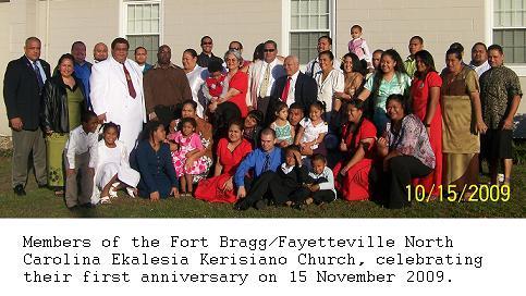 Ekalesia Fa'apotopotoga Kerisiano Amerika Samoa Fort Bragg/Fayetteville, (EFKASFBF) North Carolina celebrated its 1st Anniversary on November 15, 2009. Afterwards, the Ekalesia hosted a brunch/dinner for everyone that attended. Reverend Missionary Manaomia Tauanu'u and Faletua Se'ela also celebrated their first year as missionaries at Fort Bragg/Fayetteville, NC. This Congregations is very blessed with the musical talent of Missionary Tauanuu who has organized the church choir into one that can be easily recognized with the big choirs back home or closely match the wonderful sounds of the Kanana Fou Choir. The EFKASFBF may not have the numbers, but the sounds remind of church service in Samoa. Reverend Missionary Tauanu'u and the key leaders of the EFKASFBF have been the focal point of everything that has made this new Ekalesia a successful one today. Our many thanks to Kanana Fou, its Elders and the Missionary committee for their selection of Missionary Tauanuu.