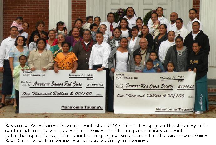 A Fiafia Night fund raiser was held to raise whatever we can send to assist with the ongoing recovery and rebuilding effort. With the small numbers available due to deployments and other absences, $2000.00 was raised. Because soldiers and their families, to include retirees, in and around Fort Bragg come from both Samoa and American Samoa, Reverend Manaomia Tauanu'u wanted to ensure that the assistance from the EFKAS Fort Bragg is sent to both American Red Cross in American Samoa and, the Red Cross Society in Samoa. EFKAS continues to offer prayers for those who lost loved ones and for the speedy recovery of all of its people.