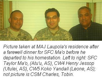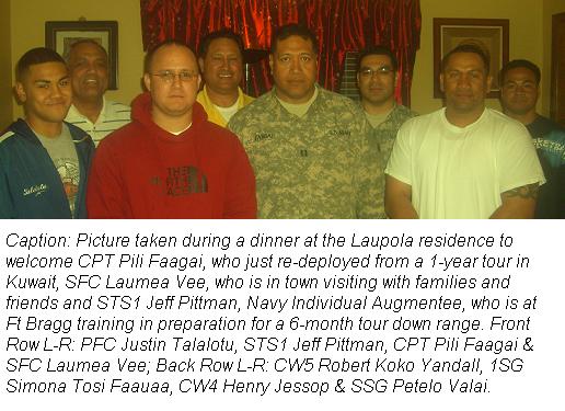 Senior Samoan military personnel at Ft Bragg, NC hosted a dinner Thursday, 12 MAR 2009, to welcome CPT Pili Faagai, SFC Laumea Ve'e and STS1 (E-6) Jeff Pittman to the home of the Paratroopers and Special Operations Command. Hosts of that evening were CW5 Robert "Koko" Yandall, CW4 Henry Jessop, CSM Charles Tobin & MAJ Laupola.