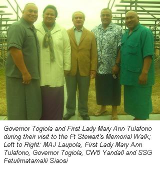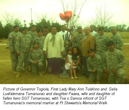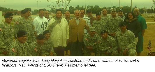 Toa o Samoa and their families at Ft Stewart, Georgia, hosted a luncheon Saturday, February 14, 2009, for Governor Togiola and First Lady Mary Ann Tulafono who were in town visiting their daughters. At the request of Governor Togiola, Sergeant Major (SGM) Talalelei Tuisalia, of Faleasao, and Randall Taufaasau, of Pago Pago, coordinated with Samoan soldiers and their families for an opportunity to meet with the Governor of American Samoa.