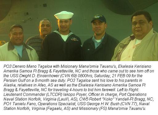 The Ekalesia Kerisiano Amerika Samoa Ft Bragg & Fayetteville, NC held a special service on Sunday, February 15, 2009, for PO3 Tagaloa's deployment. In addition, Reverend Mana'omia Tauanu'u, CW5 Robert “Koko” Yandall and MAJ Tauapai Laupola from Ft Bragg, NC traveled to Norfolk, VA and were joined by Lieutenant Commander (LTCDR) Iakopo Poyer, Officer in charge, Port Operations Naval Station Norfolk, Virginia (Lauli'i, AS) and PO1 Tanielu Fano, Operations Specialist, USS George H.W. Bush (CVN 77), Naval Station Norfolk, Virginia (Fagaalu, AS) were on deck to bid farewell to PO3 Tagaloa.