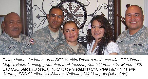 He also extend his heartfelt appreciation to Reverend Mana'omia Tauanuu and MAJ Laupola of the Ekalesia Kerisiano Amerika Samoa Ft Bragg & Fayetteville for taking that long trip to attend his graduation as well as his sponsored families at Ft Jackson,SC, SFC Pele Hunkin-Tajalle and SSG Sivailoa Uso-Macon. In a telecon with PFC Maga's mother, Moana Maga, she thanked Samoans at Ft Jackson, SC and Ft Bragg, NC for the love and support for her son and confirms her beliefs that there are Samoans in the military that look out for the interest of Samoan service members. Your outreach program has lifted a heavy burden since my son departed, "Thank-you for everything you are doing for the sons and daughters of Samoa."
