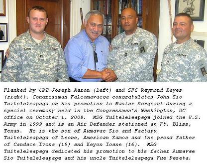 His medals include the Bronze Star medal, Meritorious Service medal, Army Commendations medal, Army Achievement medal; National Defense Service medal, Korea Service medal, Kosovo Campaign medal, Armed Forces Expeditionary medal, NATO's medal and air assault badge. MSG Falealii received his Associate of Arts degree from the University of Maryland in 2007 and he is pursuing his bachelor degree in anthropology with emphasis on child development. Send your congratulations to MSG Craig and Mattie Falealii at craig.falealii@us.army.mil FOR IMMEDIATE RELEASE August 28, 2008 Washington, D.C. -- Faleomavaega accepting applications for nomination to the U.S. Military Service Academies Congressman Faleomavaega announced today that he is currently accepting applications for nominations to fill one vacancy at the US Air Force Academy (www.usaf.edu) in Colorado Springs, Colorado, one vacancy at the U.S. Military Academy (www.usma.edu) at West Point, New York, and one vacancy at the U.S. Naval Academy (www.usna.edu) in Annapolis, Maryland for the class entering the academies in June, 2009. He is also accepting nominations for the U.S. Merchant Marine Academy (www.usmma.edu). The Merchant Marine Academy can sometimes accept more than two candidates provided there are vacancies in the national pool. To meet the high qualifying standards set forth by the academies, applicants must have a minimum Scholastic Aptitude Test (SAT) combined verbal and math score of 1,000 or an American College Test (ACT) score of 25 for English, 27 for Math, 26 for Reading, and 26 for Science Reasoning. Please keep in mind that these scores do not automatically qualify an applicant for admission. For this reason, it is recommended that all applicants take the SAT or ACT more than once if they believe they can improve their test scores. Each applicant for nomination must meet the following eligibility requirements by July 1 of the year he/she plans to enter the academy: