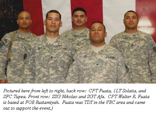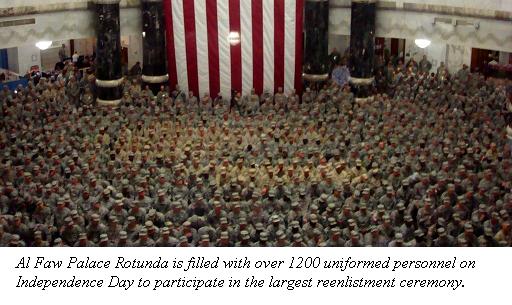 In Baghdad, Al Faw Palace made history once again on America's 232nd birthday by holding the largest reenlistment ceremony swearing in approximately 1215 U.S. service members from all four branches of the U.S. Armed Forces. The Al Faw Palace Rotunda seated over 1200 uniformed personnel. This number does not include scores of guests and media that lined the perimeter of the 1st, 2nd and 3rd floors of the rotunda. Multi-National Forces - Iraq (MNF-I) Command Sergeant Major Marvin L. Hill greeted and pumped the crowd up by leading the group in a loud and thunderous cheer of freedom. The rotunda returned fired as every voice roared the word "freedom!" Presiding over this historical ceremony, MNF-I Commanding General David H. Petraeus remarked that the magnitude of reenlisting 1215 U.S military personnel in the face of long deployments, continued separation from loved ones and loss or injury of comrades sends a powerful message to our adversaries. As General Petraeus led the Soldiers, Sailors, Airmen and Marines in the Oath of Enlistment, the rotunda echoed in unison and with purpose as the last words of "so help me God" was repeated. Petraeus said, "It is the greatest of honors to soldier here with you." Three sons of Samoa participated in this historical reenlistment ceremony. SGT Ioane Puni Afa, SSG Albert P. Nikolao, and SPC Daniel O. Sei each have their own personal reasons for continuing their careers as Soldiers. SGT Ioane Puni Afa is the proud son of Puni and Moesolo Afa of Siufaga and Ta'u, Manua. SGT Afa and his lovely wife, Pearl Afa, have two sons, Brandon and Maximus, ages 14 and 7 respectively. Afa is a member of the 1st Armored Division deployed from Baumholder, Germany stationed at the Joint Security Station, Sadr City. He is an 88M, a Motor Transport Operator, which by the shear nature of that job description and his comments, he and unit members frequently traverse the dangerous Sadr City roads transporting cargo and personnel to meet mission requirements. SGT Afa is no stranger to deployments to Iraq as he is currently on his 3rd deployment to this Area of Operations (AOR). His first two deployments began with Operation Desert Shield/Desert Storm and the second deployment in 1992. With regard to Samoans and the military, Afa says, "Samoans are strong, smart and provides good leadership; they are excellent role models for new generations." When asked why he reenlisted on this date? He says "it's my dad's birthday. I want to wish him a Happy Birthday and that the good Lord will continue to bless him with many more years to enjoy." SGT Afa would like to thank all families and friends of Samoa and for their continued prayers. In closing, Afa simply says to "keep praying."