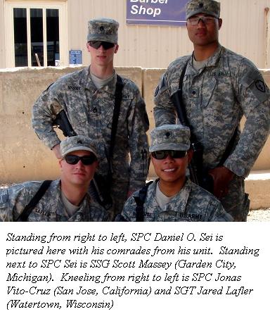SSG Albert P. Nikolao is the proud son of Otila Salanoa and Harrison Nikolao of Falefa, Upolu and Utulei, Tutuila, respectively. Already serving ten years, Nikolao reenlisted for six more years. He says he will definitely do 20 years of service. Nikolao, stationed at Camp Taji, is a member of the HHC 2nd Brigade, 25th Infantry Division Stryker Brigade Combat Team (2/25 SBCT) deployed from Schofield Barracks, Hawaii. Just like SGT Afa, Nikolao is no stranger to deployments. In 2004, he was deployed to Afghanistan. When asked if there was a difference between the two AORs at the "grunt" level, he responded, "In Afghanistan, we didn't have to worry about IEDs; here in Iraq, we do." SSG Nikolao enjoys the traveling involved with the military. He and his sister, Fatuaiga (Air Force) are the only two of the six Nikolao children serving in the military.
