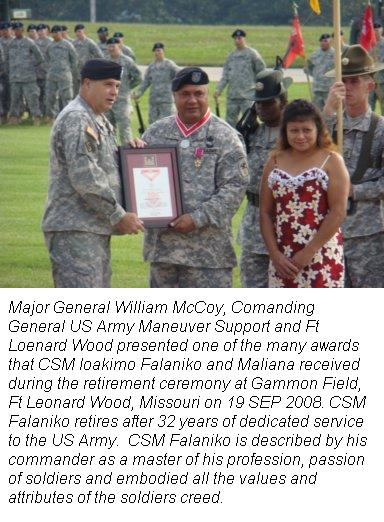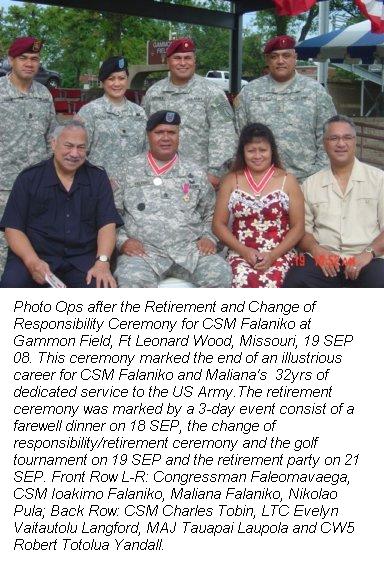 After the ceremony, a golf tournament, hosted by First Sergeant (1SG) (RET) Tautalasoo Maulupe and all of CSM Falaniko's golfing friends, was held at Piney Woods Golf Course, Ft Leonard Wood, Missouri. Close to 200 people came out to play in support of CSM Falaniko's retirement golf tournament. The day ended with a gathering at CSM Falaniko's residence. On Saturday, September 20, 2008, CSM Falaniko and his wife Maliana hosted a retirement party for all their friends and families as well as soldiers of the 1st Engineer Brigade. 1SG (RET) Tautalasoo Maulupe was the Master of Ceremony (MC). After the MC greeted all the dignitaries and introduced the head-table, Pastor Faitele Faitele said the invocation. A special tribute to Prisoner of War, Missing in Action and Private Jonathan Falaniko was observed followed by a lavish dinner catered by the Luuga family of Indiana and the Ft Leonard Wood Samoan community. A beautiful Polynesian show culminated the evening festivities. After the show, CSM Falaniko thanked all the military VIPs, Congressman Faleomavaega, his cousin Nikolao Pula and all his family, Samoans in uniforms who traveled to Ft Leonard Wood and everybody who contributed to the last three days of festivities; may God’s blessings of love and prosperity upon each and every one of you. After CSM Falaniko's remarks, everybody joined hands while Congressman Faleomavaega led the audience with the singing of the Samoan spiritual anthem, "Lota Nuu" followed with the benediction by Pastor Faitele Faitele. CSM Falaniko has been the senior enlisted soldiers for 1st Engineer Brigade, Ft Leonard Wood Missouri, the largest Brigade in the Army for the past two years. CSM Falaniko is well respected in his military occupational specialty (MOS) of combat engineer that his reputation has preceded him in every tour of duty he was assigned; hence, the reason why soldiers, friends and families have traveled from afar for his special day. CSM Falaniko's sphere of influence did not limit him to his MOS rather he reached out to help Samoans and Pacific Islanders in every installation he was assigned. As a result of been a great ambassador for the Pacific Islanders, he was awarded the Federal Asian Pacific American Council (FAPAC) award in recognition of his significant contributions to the advancement of Asian Pacific Americans (APA) and the promotion of equal employment opportunity in the Federal work force in May 2001. CSM Falaniko started his military career as a combat engineer at Fort Leonard Wood, Missouri and it's only fitting that he end it at the home of the Engineer. His stateside assignments include: Fort Belvoir, Virginia; two tours at Fort Leonard Wood, Missouri; Fort Bragg, North Carolina; Fort Bliss, Texas; and Fort Lewis, Washington. His overseas tours include: Hanau, West Berlin; Giessen, Germany; Camp Indian and Camp Howze, Korea and recently served in Operation Iraqi Freedom, Iraq.