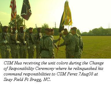 Applicants interested in applying to the U.S. Coast Guard Academy must apply directly to the Coast Guard Academy since it has its own application process which does not include nominations from Members of Congress. Interested applicants may contact the Coast Guard Academy online at www.cga.edu. Candidates who are successful in gaining admission to one of the service academies, which are ranked among the top rated educational institutions in the United States, can look forward to being challenged academically and physically. They will also receive a four-year education which ranges in value from $350,000 to $500,000, and the opportunity to serve as an officer in the U.S. Armed Forces. For more information, please contact Faleomavaega's office in Utulei at 633-1372. CSM Tuileama To'atolu Nua's Change of Responsibility Ceremony ![]() On August 7, 2008 Command Sergeant Major (CSM) Tuileama To'atolu Nua relinquished his command as the senior enlisted of the 44th Medical Command to CSM Edwin Perez at a Change of Responsibility ceremony held at Seay Field, Ft Bragg, NC. This ceremony marked the passing of the colors from CSM Nua transferring all command responsibilities of the 44th Medical Command to the incoming CSM Edwin Perez. The ceremony was commenced with the formation of Troops followed by the invocation, presentation of colors and honors to the Nation. After saluting the Flag of the United States, the official Change of Responsibility took place. CSM Nua receives the color from the gatekeeper in which he passes it on to the Brigade Commander, Colonel Maul who in turns passes it to the incoming CSM Perez who passes it back to the gatekeeper. This was followed by remarks from the Commander COL Maul, out-going CSM Nua and incoming CSM Perez.
