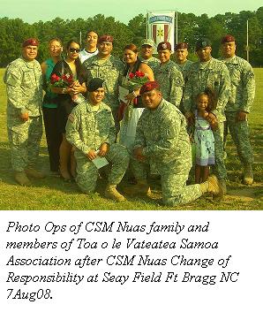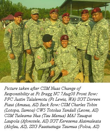 SGT Ponafala is preparing for her 2nd deployment in 3 years. As part of her preparation, she ensures that her Home of Record (HOR) is changed from California to American Samoa. On July 8, she received a confirmation letter from the Army Human Resources Command that her HOR is officially changed to American Samoa. She is now in the process of registering to vote for ASG upcoming election as a privilege made possible by the ASG Military Voting Law signed by Governor Togiola in May of this year. SGT Ponafala now joins the NCO Corps, "a member of the time honored corps which is known as The Backbone of the Army". The Toa o le Vateatea Samoa Association congratulates SGT Ponafala for her accomplishment, which is a credit to herself, her parents, her families, her villages and her faith. CSM Charles M. Tobin Selected as the CSM for the Sustainment Brigade Special Operations (Airborne), Ft Bragg, NC Written by MAJ Tauapai Laupola Toa o le Vateatea Samoa Association (TVSA) Ft Bragg, NC, welcomes Command Sergeant Major (CSM) Tobin, a native of Lotopa, Samoa to his new post as the CSM for the Sustainment Brigade Special Operations (Airborne), Ft Bragg, North Carolina. CSM Tobin is the son of the late Michael and Barbara Tobin of Lotopa, Samoa. CSM Tobin came to Ft Bragg from the 377th Theater Sustainment Command (TSC), New Orleans, Louisiana.