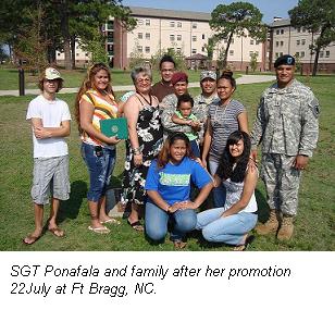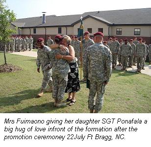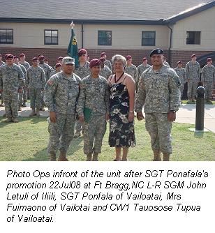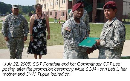 Once the unit was formed, the command, attention to orders was called and the promotion orders were read as Mrs. Anna Suani Ponafala Fuimaono pinned-on Sergeant ranks on her daughter while the unit Commander, CPT Small, Lee and First Sergeant McCartney looked on. SGT Antoinette Ponafala graduated from the Warriors Leaders Course (WLC) Class 09-08 on May 8, 2008 at Ft Bragg, N.C. This course is a requirement for promotion to the Non Commissioned Officer (NCO) Corps that starts with the rank of sergeant or E-5. According to SGT Ponafala's mother, "It was an honor to promote my daughter in front of her unit and Samoans at Ft Bragg, NC, however, it's not complete without my husband, HC Fuimaono Ponafala". These sentiments were echoed by SGT Ponafala when asked about her feelings during this momentous occasion, "I am very happy for my mother; however, I still have a void in my heart because my father is not here to witness this important event due to other family obligations. I love you dad and missed you a lot until we meet again." SGT Ponafala expressed her sincere appreciation to her parents, Fuimaono & Anna Ponafala, to all her families in Vailoatai, Leone and Vatia, to her Ft Bragg family, Toa o le Vateatea and especially to her spiritual parents in Vailoatai, Reverend Faletoi and Violina Lagoo Uso. This is your promotion as well because of your prayers, love and never ending support commented SGT Ponafala.
